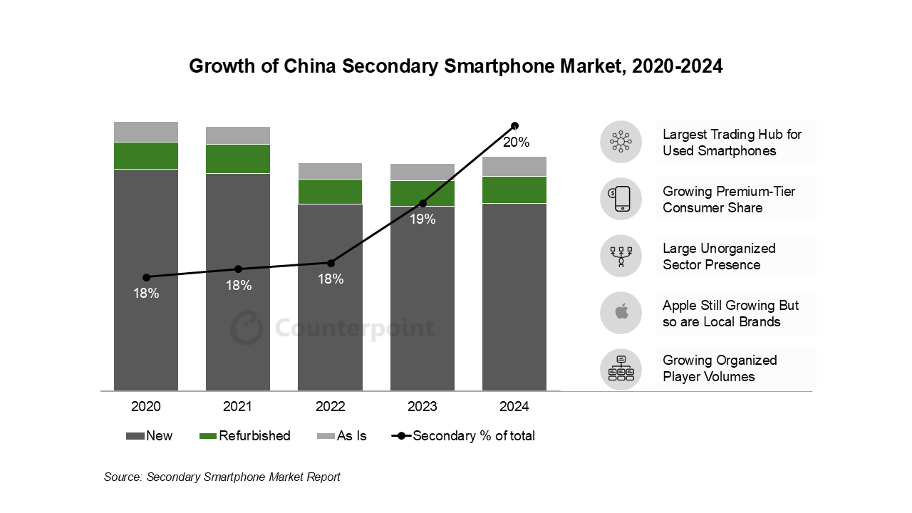 近日,CounterPoint Research发表文章称,中国二手智能手机(翻新和原装二手)的销量已占全国智能手机总销量的20%,是全球规模最大的二手和翻新智能手机市场,且根据调查显示,2024年中国二手智能手机出货量同比增长6% 。
