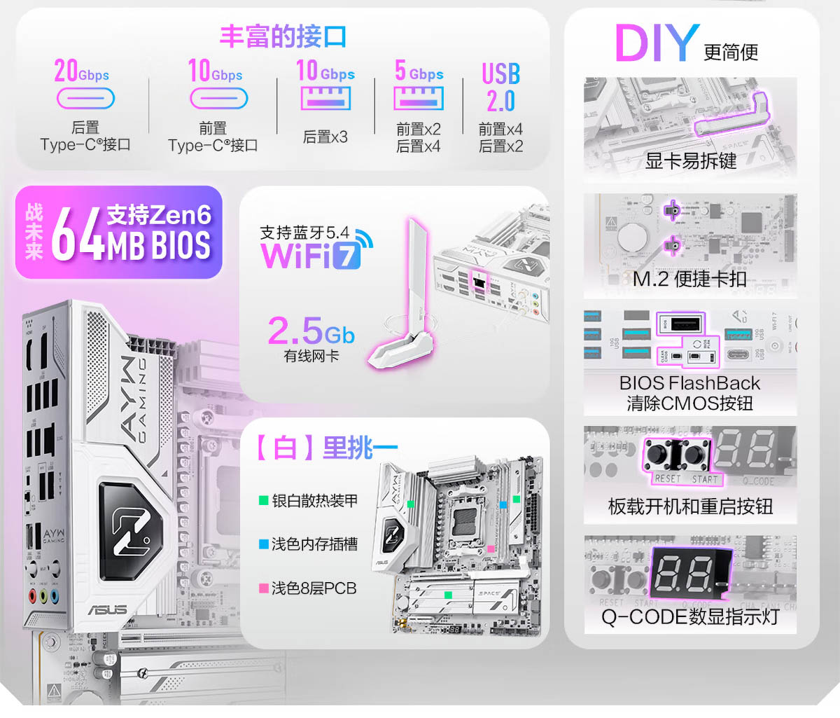 华硕最近推出的B850M AYW GAMING OC WIFI7 W,在宣传图片上写着这主板用的是64MB BIOS,并且支持未来的Zen 6处理器,实际上此前微星已经有AM5主板换用64MB BIOS,并且暗示支持Zen 6,难道Zen 6处理器的支持真与64MB BIOS有关?