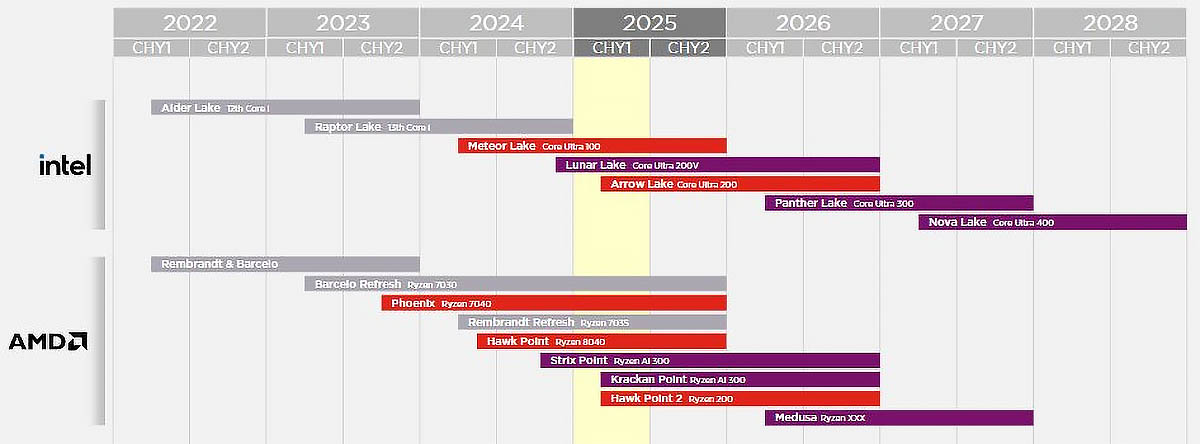 前段时间有人分享了Intel和AMD未来一两年的移动处理器产品线路图,现在又有了新的版本,新泄露的线路图补充了Intel在2027年之后的产品信息,不过这份线路图相比之前的要简化了许多。