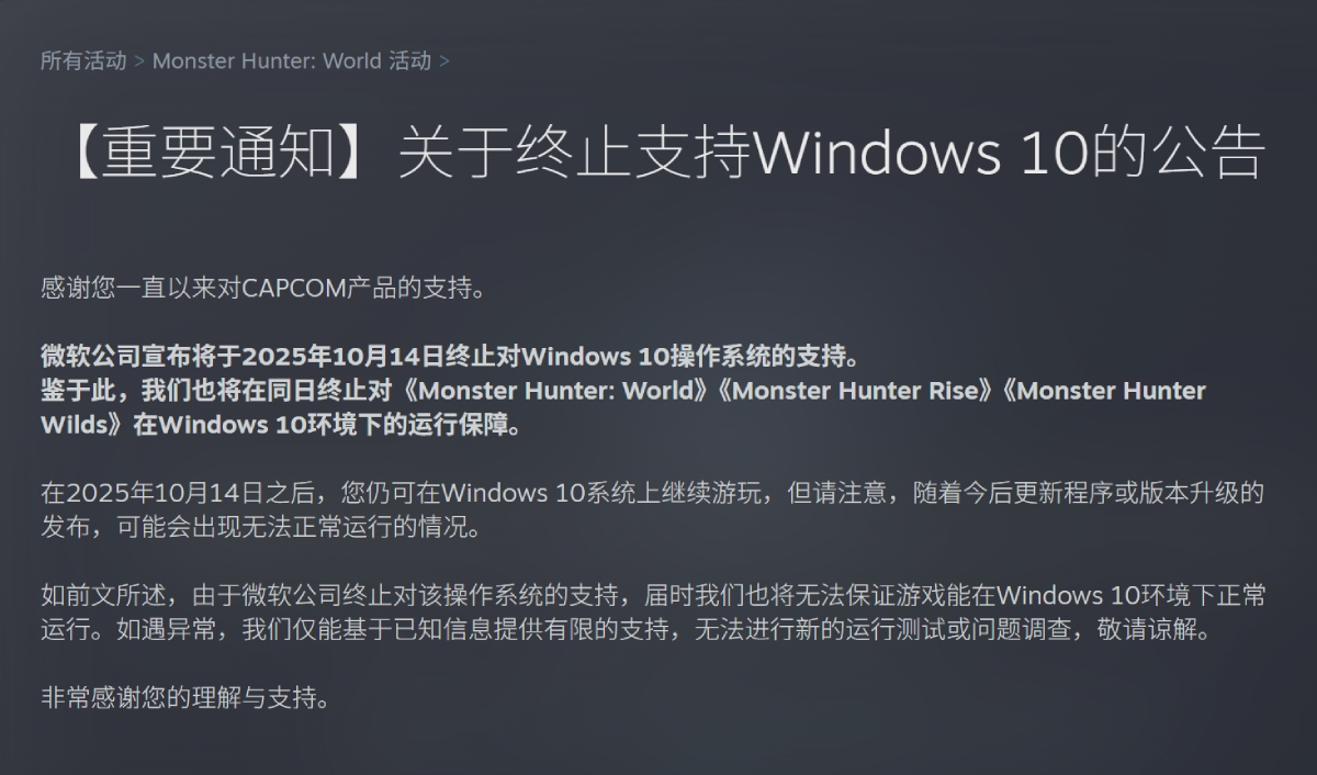 时间来到9月底,距离微软公布的终止Win10系统支持截止日期仅剩半个月时间,虽说终止支持并非意味着系统无法使用,但对于一些软件开发者来说,可能会选择在发布新版本时不会专门对Win10系统进行支持和优化,这其中也包括游戏及其背后的制作公司。近日,Capcom卡普空就在Steam页面中发布了一则公告,称旗下《怪物猎人》系列游戏将会与微软同步终止对Win10系统的运行保障,玩家虽然依然可以在Win10系统下运行现版本游戏,但不保证后续版本更新后仍可以在Win10下正常运行。